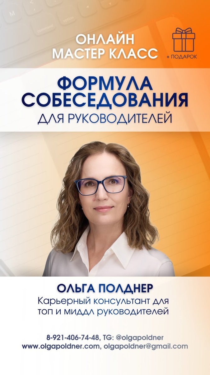 ФОРМУЛА СОБЕСЕДОВАНИЯ ДЛЯ РУКОВОДИТЕЛЕЙ ПРАКТИЧНЫЙ ОНЛАЙН МАСТЕР КЛАСС 👆04 ДЕКАБРЯ, ЧЕТВЕРГ, 19.30 ПО МСК ПРОВОДИТ ЛИЧНО ОЛЬГА ПОЛДНЕР, Карьерный консультант для топ и миддл руководителей БУДЕТ ПОЛЕЗНО для РУКОВОДИТЕЛЯ, который: ⏺ Никогда не искал работу, она его находила сама, не проходил собеседований с «внешними» людьми, кроме своих знакомых; давно не был на собеседованиях ⏺ Испытывает сложности с «правильными» ответами на вопросы: почему именно вы – лучший кандидат, причины увольнения, слабые стороны, почему хотите в найм из своего бизнеса, кем себя видите через 5 лет, и т.д.? ⏺ Хочет качественно подготовиться к собеседованию в компанию мечты ⏺ Сомневается, как правильно называть и обсуждать свои зарплатные ожидания ⏺ Часто получает отказы после встречи с рекрутером / HR-ом и не уверен, как «правильно» отвечать на их вопросы: стандартные, необычные, сложные, глупые, скользкие, ставящие в тупик и т. д. ⏺ Готовится к очень важным переговорам с генеральным директором / собственн