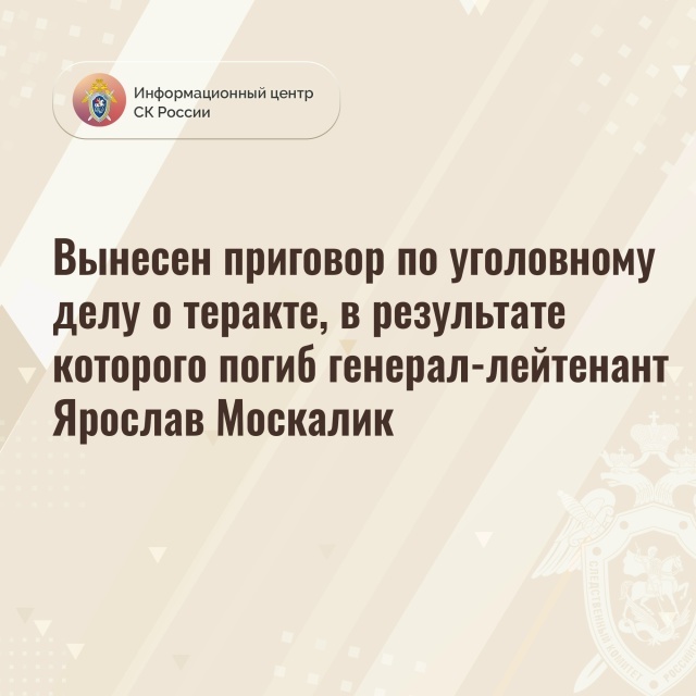 Вынесен приговор по уголовному делу о теракте, в результате которого погиб генерал-лейтенант Ярослав Москалик На основании доказательств, собранных Следственным комитетом Российской Федерации, вынесен приговор по уголовному делу в отношении Игната Кузина. Он признан виновным в совершении террористического акта, незаконном изготовлении и обороте взрывчатых веществ и взрывных устройств, а также ряда других преступлений (ст.ст. 205, 222.1, 223.1 УК РФ). Следствием и судом установлено, что с февраля по апрель 2025 года Кузин, завербованный службой безопасности Украины, по заданию своего куратора подготовил и установил самодельное взрывное устройство возле подъезда дома на бульваре Нестерова в городе Балашихе Московской области, где проживал заместитель начальника Главного оперативного управления Генерального штаба Вооруженных Сил РФ генерал-лейтенант Ярослав Москалик. Утром 25 апреля 2025 года, когда Москалик вышел из подъезда своего дома, самодельное взрывное устройство было дистанционно