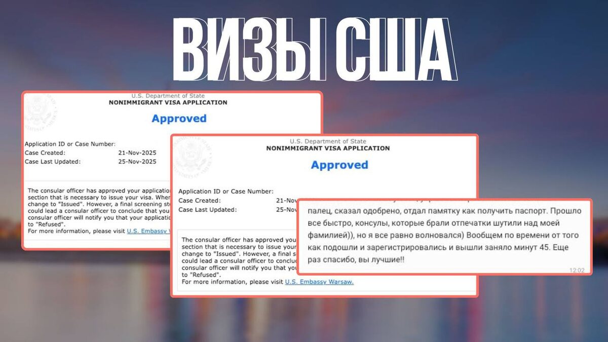 🇺🇸 Визы США после технического отказа 25 ноября: одобрена одна первичная и одна повторная туристические визы гражданам РФ в Варшаве . Оба заявителя получили технический отказ в сентябре 2025 и сразу записались на Польшу. Кейс: семейная пара, супруг имеет ИП ( была виза J1 и отказ в 2016), супруга – руководитель филиала в сфере промышленности, (виз США ранее не было). Цель поездки – туризм по маршруту: Лос-Анджелес, Сан-Франциско, Йосемити, Нью-Йорк. За 5 лет посетили 9 стран, включая визовые. Вопросы консула: – Вы пара? – Какие планы на поездку? – Цели только туристические? – Когда планируете поездку? – Кем вы работаете? – Есть ли у вас дети? – Что Вы делали в США 15 лет назад? (Вопрос супругу) – Вы родились в Германии? Говорите по немецки? После ответов на вопросы консул одобрил визы США. Получить визу с нами ⬅️ Успеть забрать выгодное предложение по визам, картам и экскурсиям до 30 ноября ⬅️ #кейс #виза_сша