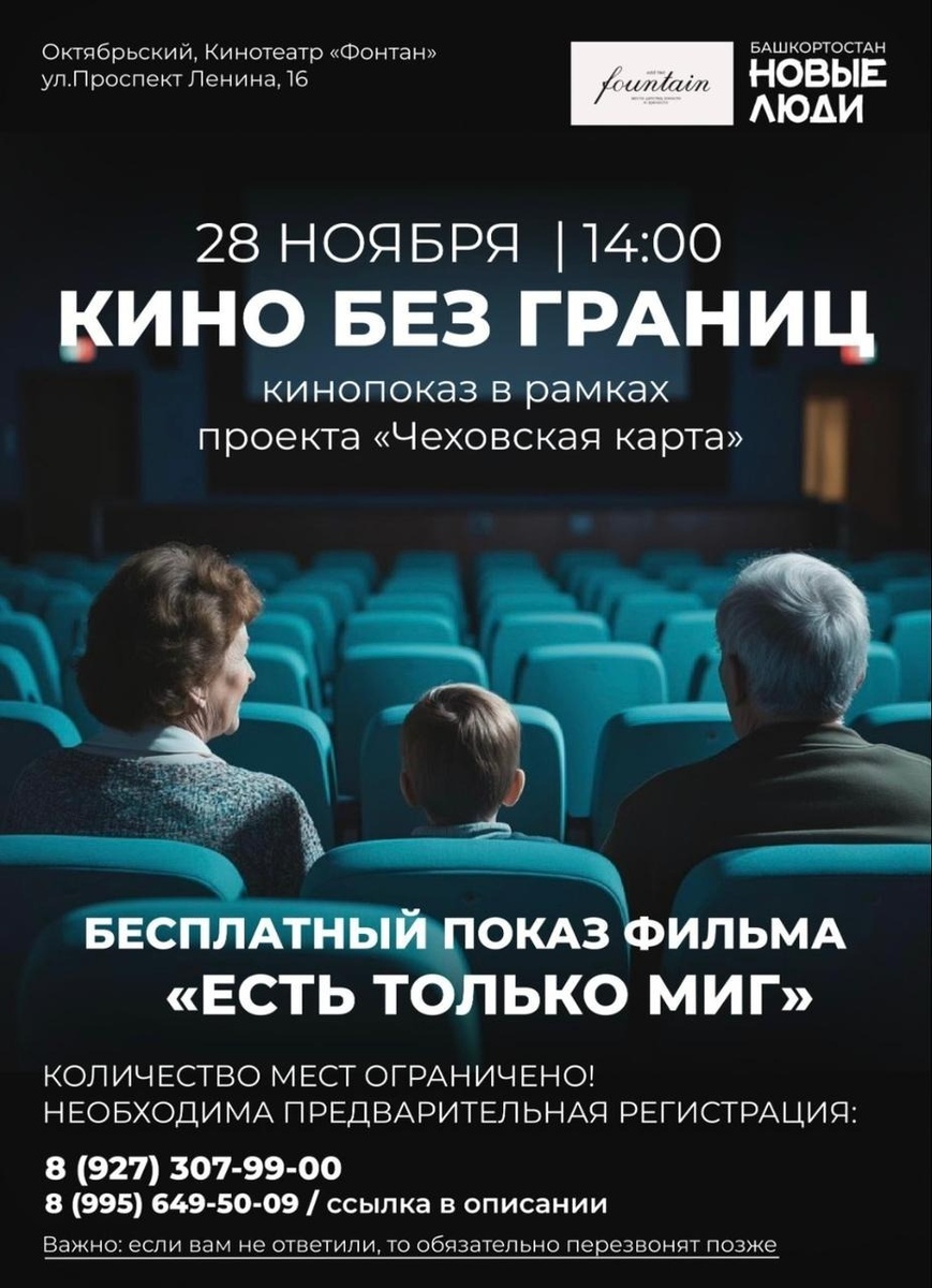 28 ноября, в 15.00, в кинотеатре «Фонтан» состоится бесплатный показ для граждан пенсионного возраста кинофильма «Есть только миг». Организатор мероприятия — партия «Новые люди», которая выступила с инициативой создания «Чеховской карты». Программа поддержки активных жителей старшего поколения Башкортостана аналогична «Пушкинской карте» для школьников или карте «Серебряный возраст», которой успешно пользуются жители Санкт-Петербурга. «Чеховская карта» направлена на поощрение участия возрастных жителей в культурной, спортивной и общественной жизни региона. Её обладатели смогут с помощью государственной поддержки бесплатно посещать музеи, театры и кинотеатры. Депутат городского Совета Дмитрий Вайсброт пояснил, что для создания карты сейчас изучаются общественное мнение и спрос у населения на это новшество: — Бесплатные кинопоказы проводятся по всей России в поддержку проекта и для определения востребованности у населения пенсионного возраста организации культурного досуга. При положитель