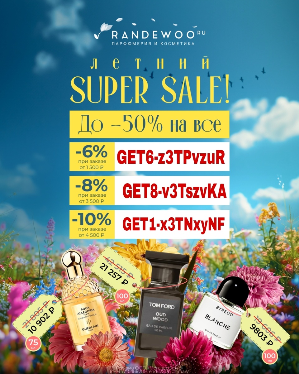 🌸 Скидки на парфюмы и косметику для ВСЕХ! В Randewoo собрана уникальная коллекция ароматов любой вкус и кошелек. По секрету – ТОЛЬКО здесь есть селективные парфюмы Angeline! 🤫 Переходи по ссылке для удобства: https://gtblg.ru/ug3HQy?erid=2SDnjcEjmaW Получай доп. выгоду по промокодам 🎁👇 🔹GET14-z3TQzx3B – скидка 10% на все парфюмы Angeline (без мин. суммы заказа) 🔸GET1-x3TNxyNF – скидка 10% на один любой заказ от 4 500₽ 🔸GET8-v3TszvKA – скидка 8% на один любой заказ от 3 500₽ 🔸GET6-z3TPvzuR – скидка 6% на один любой заказ от 1 500₽ СУММИРУЮТСЯ со всеми скидками на сайте ❤️🔥 Доставка по всей России и в страны СНГ. Не действуют на бренд Marc-Antoine Barrois.
