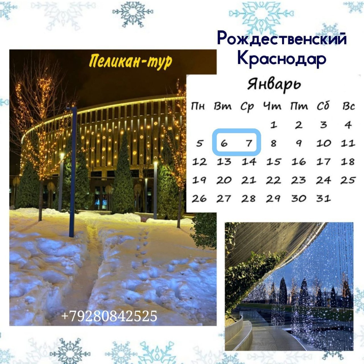 💙💙💙💙💙💙💙💙💙💙💙💙💙💙 💙💙💙💙💙💙💙💙💙💙💙 🎄 Путешествие в Рождественскую сказку в Краснодаре! 🎄 ✨Отправимся в волшебное путешествие 6-7 января 2026 года для того чтобы окунуться в атмосферу настоящей рождественской сказки! ✨ 💙 Цена тура: 7900 RUB/чел 💙В стоимость входит: проезд, проживание, сопровождение. 💙Дополнительные расходы: питание 💙Что вас ждет💙 Посещение парка Галицкого, украшенного миллионом огней, создающих великолепное ощущение праздника вечером. Это место подарит вам незабываемые впечатления и магическую атмосферу! 💙План путешествия: 💙 1-й день: Заселение в отель, время на отдых Вечерний выезд в сказочный парк Галицкого — наслаждение иллюминацией и праздничной атмосферой Свободное время для прогулок по городу, украшенному огнями 💙 2-й день: Завтрак Посещение дневного парка Галицкого Прогулка по ТЦ "Oz Mall" Возвращение домой Обратите внимание: программа может меняться по усмотрению организатора. Важно: поездка без экскурсовода. 💙Места огран