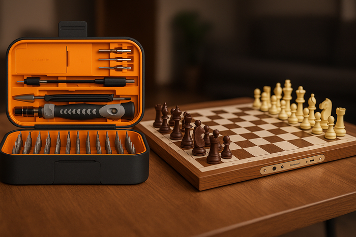 Шахматы Chessnut Air совмещают классическую деревянную доску и технологию распознавания фигур. Система фиксирует каждый ход автоматически, отображая его на экране или передавая в приложение. Игрок может соревноваться с компьютером, другом или соперником из сети, оставаясь при этом за реальной доской.