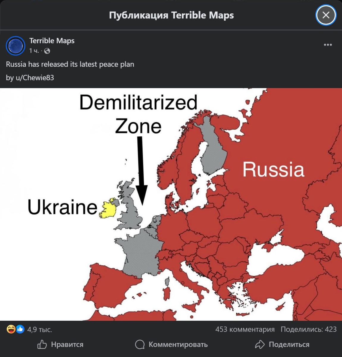 Канал на Facebook(запрещен в РФ) "Terrible Maps" с 1.3 миллионами подписчиками только что опубликовал такую карту, которую подписал как "Россия выпустила свой последний план мира". Думаю по карте понятно где Россия. Серым цветом - демилитаризованная зона. Желтым - Окрайна. В комментариях люди пока смеются.