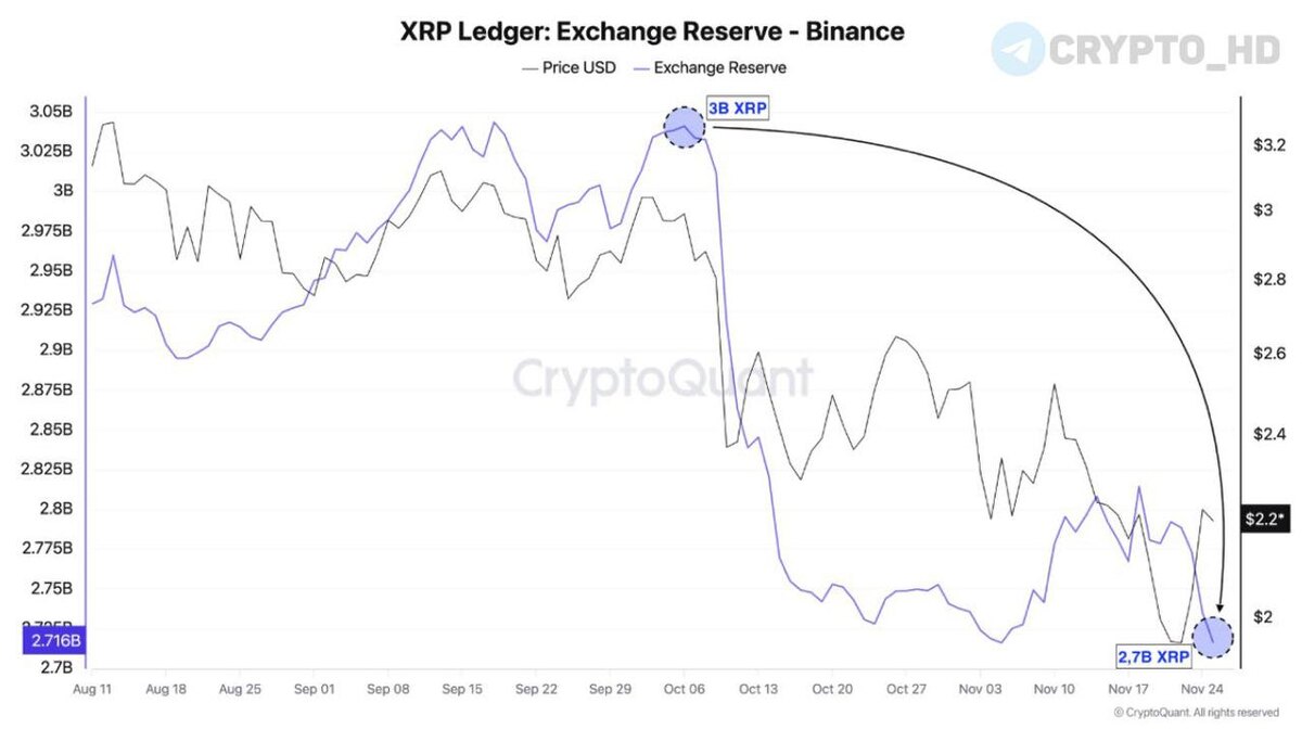 💧 CryptoQuant: Резервы #XRP на Binance стремительно сокращаются – с 6 октября с биржи вывели 300,000,000 XRP ($655m).