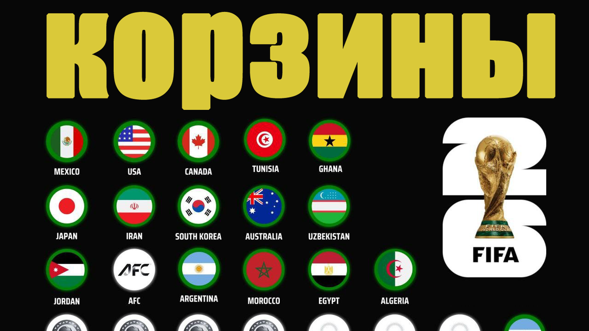 Стали известны составы корзин перед жеребьёвкой ЧМ по футболу 2026. В турнире примут участие 48 команд, но на данный момент известно только 42 участника. Это: 48 участников будут поделены на 4 корзины, а затем в ходе жеребьёвки, которая состоится 5 декабря, будет сформировано 12 групп. Смотрим состав корзин: Корзина 1: Канада, Мексика, США, Испания, Аргентина, Франция, Англия, Бразилия, Португалия, Нидерланды, Бельгия, Германия. Корзина 2: Хорватия, Марокко, Колумбия, Уругвай, Швейцария, Япония, Сенегал, Иран, Республика Корея, Эквадор, Австрия, Австралия. Корзина 3: Норвегия, Панама, Египет, Алжир, Шотландия, Парагвай, Тунис, Кот-д’Ивуар, Узбекистан, Катар, Саудовская Аравия, ЮАР. Корзина 4: Иордания, Кабо-Верде, Гана, Кюрасао, Гаити, Новая Зеландия, + 6 победителей плей-офф. Оставшиеся 6 путёвок на ЧМ 2026 разыграют в стыках. Посмотрим подробнее: Путь A (Италия/Северная Ирландия/Уэльс/Босния), Европейский плей-офф. Путь B (Украина/Швеция/Польша/Албания), Европейский плей-офф. Пут