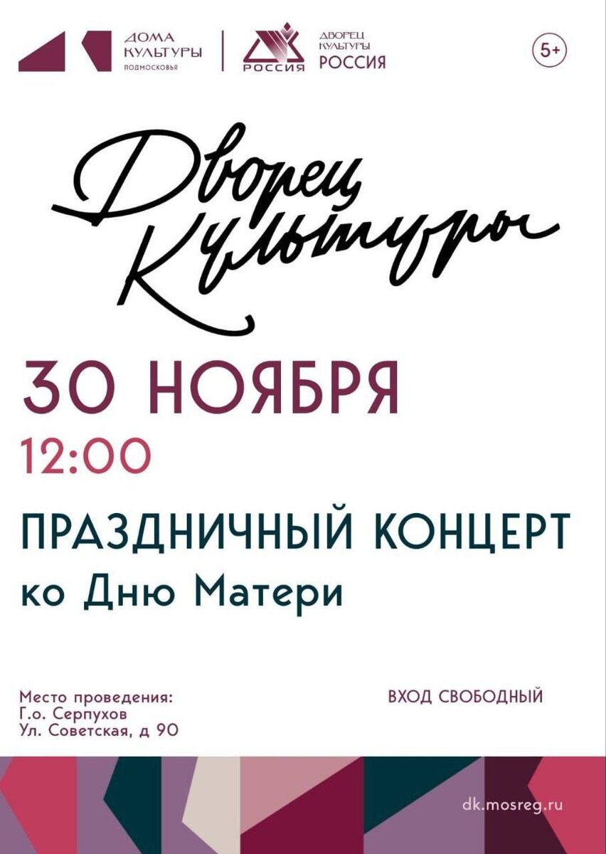 🌟 Концерт ко Дню матери в ДК «Россия»! 🌟 Дорогие друзья! Приглашаем вас на тёплый и душевный праздник, посвящённый самому главному человеку в жизни каждого — маме! 📅 Дата: 30 ноября ⏰ Время: 12:00 📍 Место: ДК «Россия» (г. Серпухов, ул. Советская, д. 90) 🎟 Вход свободный 👥 Возрастное ограничение: 6+ В программе — самые трогательные номера: лирические песни о маме в исполнении юных артистов и вокальных коллективов; нежные танцевальные композиции; сюрпризы и поздравления от детей. Это будет особенный день, наполненный: искренними словами благодарности; тёплыми объятиями; музыкой, от которой сердце замирает; атмосферой любви и семейного тепла. Приводите своих мам, бабушек и всех, кого считаете родными и близкими! Вместе мы создадим незабываемый праздник, который подарит радость и светлые эмоции каждому. Ждём вас на концерте ко Дню матери — давайте скажем «спасибо» самым дорогим людям вместе!