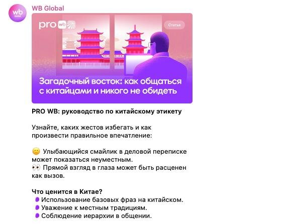 WB рассказывает, как правильно общаться с китайцами Канал WB опубликовал гайд по китайскому этикету: какие жесты уместны, где не переборщить со смайликами, и как смотреть, чтобы никого не обидеть. Тема, конечно, полезная. Особенно учитывая, что китайских продавцов на площадке становится всё больше — скоро это руководство пригодится уже не покупателям, а конкурентам по категории. Marketplace_biz - отдай свой буст каналу