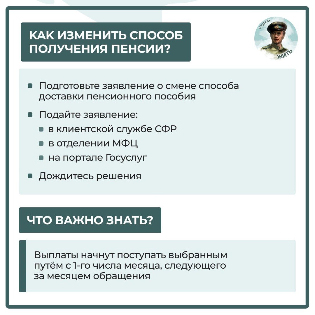 📌 Полезная информация для жителей воссоединённых регионов Что важно знать? Чтобы изменить способ получения пенсионных выплат или реквизиты банковского счёта, необходимо подать соответствующее заявление⤴️⤴️⤴️ На что обратить внимание? Рассмотрение занимает до 3 рабочих дней. Телефон для консультаций: 📞 +7 (800) 100-00-01 #пенсии ————— Поддержите канал Подпиской на "Сыны Отечества" или Голосом за канал ✅ подписаться |⚡️проголосовать 📲Наш проект в социальных сетях: Вконтакте, Одноклассники, Дзен, RuTube Теперь мы и в МАХ!