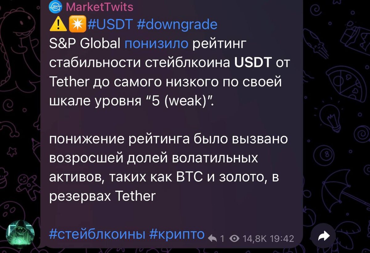 Почему золото и биткойн в резервах Tether — это не плюс, а риск для рейтинговых агентств Инвесторы, пролетела новость, что рейтинг USDT упал до минимального уровня. Что происходит? Есть ли риски для нас? Давайте копнем чуть глубже. S&P — это не про философию. Не про циклы. Не про «биткоин — новое золото». S&P — про риск-модель, в которой главное — способность эмитента выполнить обязательства при любом сценарии. А обязательства у Tether простые как дверца сейфа: за каждый 1 USDT инвестор должен получить 1 доллар наличных. И вот здесь начинается самая интересная часть. Когда S&P видит в резервах стейблкоина BTC и золото, он не видит «надёжные активы». Он видит: – активы, которые могут просесть на 10–20% за неделю; – активы, которые нельзя мгновенно ликвидировать на весь объём без влияния на цену; – активы, чья стоимость зависит от рыночной психологии (в момент паники падают ещё быстрее). Для S&P это простая математика: чем выше волатильность резервов — тем ниже надёжность погашен