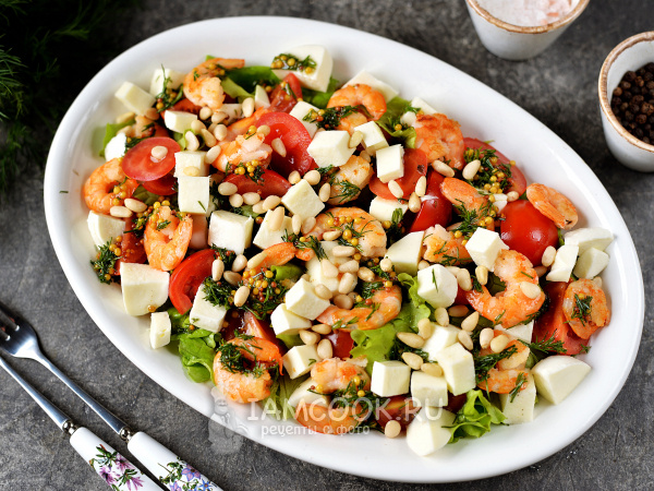 Салаты с креветками всегда получаются яркими, вкусными и праздничными. У нас креветки не бывают постоянными жителями холодильника, поэтому в Новый год мы готовим их с особым удовольствием. Подходят любые: крупные, мелкие, очищенные и в панцире. Главное - не передержать. Маленькие готовятся пару минут, крупные - чуть дольше. Есть мнение, что такие салаты больше по душе женщинам, но мужчины тоже едят их с огромным удовольствием. Мы сами ценим такие салаты за лёгкость и приятный вкус. Попробуйте включить один вариант в новогоднее меню. В подборке есть из чего выбрать, а пару целых креветок сверху всегда делают подачу красивее😉 Салат «Ибица» с креветками и сыром моцарелла ИНГРЕДИЕНТЫ: Калорийность: 167 кКал Время приготовления: 20 мин. Посмотреть пошаговый рецепт с фото >> ———————— Салат «Комплимент» с креветками и ананасом ИНГРЕДИЕНТЫ: Калорийность: 170 кКал Время приготовления: 30 мин. Посмотреть пошаговый рецепт с фото >> ———————— Салат с креветками, ананасом и яйцом ИНГРЕДИЕНТЫ: Калор