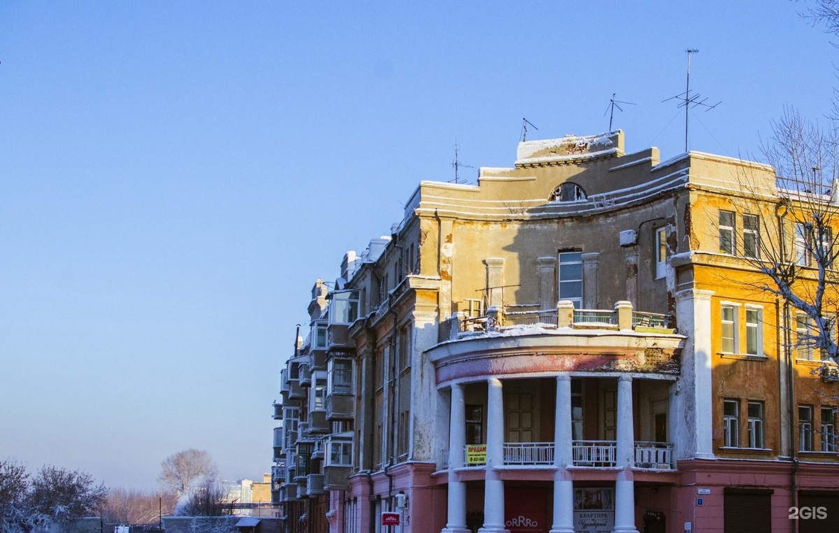 Напоминаю, что эта статья пойдёт в подборку "Иркутск нулевых", ибо фотографии в статье старые. Из относительно современных - вот, снимок, взятый с карты 2Гис: Шикарный дом, привлекающий к себе внимание прохожих. Пышное здание с шикарной колоннадой и огромными террасами на улице Чудотворской, 1, бывшей Бограда. Любим мы переименовывать в России всё туда-обратно:) Когда-то здесь стояла Чудотворская церковь. Очень, очень красивая: Теперь о ней напоминает лишь табличка: И ещё строение позади бывшего роддома (это, скорее, угол с улицей Сурикова): Вообще до революции эта местность выглядела вот так: Итак, эффектный дом водников: У меня, кстати, сразу возникают ассоциации с Омском, ибо там тоже есть Городок Водников: В иркутском доме водников получали квартиры работники Восточно-Сибирского речного пароходства. Мы туда один раз с приятелем... случайно зашли и... поднялись на полукруглый балкон. Просто повезло, - иначе не скажешь: Дом построили в 1938 году и так вышло, что дом стоит на месте бы