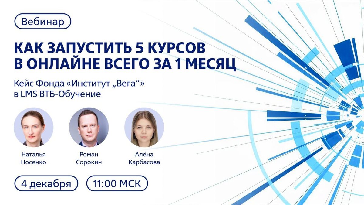 🚀 Как запустить онлайн-обучение всего за 1 месяц? ❗️ВТБ Образование и Фонд «Институт „Вега“» расскажут об этом на открытом вебинаре. ➡️Фонд «Институт „Вега“» принял решение запустить 5 математических спецкурсов в LMS ВТБ-Обучение всего за 1,5 месяца до старта семестра — и начал обучение точно в срок. На вебинаре разберем, как сочетание технологий и грамотной организации помогает вузам переходить к системному онлайн-обучению быстро и безболезненно. 🔹Что будет на вебинаре: 🔸Практический кейс: как выстроить синхронное обучение, организовать работу преподавателей и студентов и запустить курсы в сжатые сроки. 🔸Эксперты ВТБ Образования: расскажут о ключевых возможностях LMS и о том, как платформа помогает автоматизировать рутину и повышать качество обучения. 🔸Розыгрыш: подарки самым активным участникам. ❓ Кому будет полезно: ✅проректорам по цифровизации и развитию и членам их команд ✅руководителям образовательных программ и проектов по развитию дистанционного обучения ✅препод