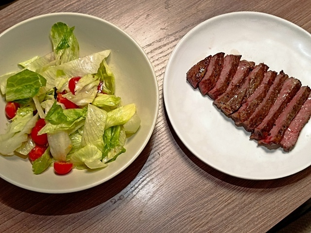 Сегодня решил приготовить стейк по методу Хестона Блюменталя. Этот способ он показывал на одном из своих шоу - "In search of perfection", где он показывает и рассказывает, о том, как готовить блюда, такие как картофель фри, фиш эн чипс и др. по научному. Хестон предлагает различные способы приготовления стейка. Например можно опалить стейк с помощью мощной горелки для проведения реакции Майяра, которая придает стейку коричневую корочку и "жареный" вкус. Затем стейк помещается в духовку на 24 часа при температуре 80 градусов. Эта температура не позволяет мясу выпустить весь сок, а также активирует ферменты, которые начинают расщеплять мясные белки, создавая больше аромата и вкуса стейка. После этого стейк обжаривается на сверхгорячей сковороде и смазывается сливочным маслом с ароматом блючиз. Подается такой стейк с салатом, состоящим из помидоров, салата айсберг и винегретной заправки. Я приготовил стейк по другой методике Хестона, а конкретнее - переворачивать стейк на сковороде каждые