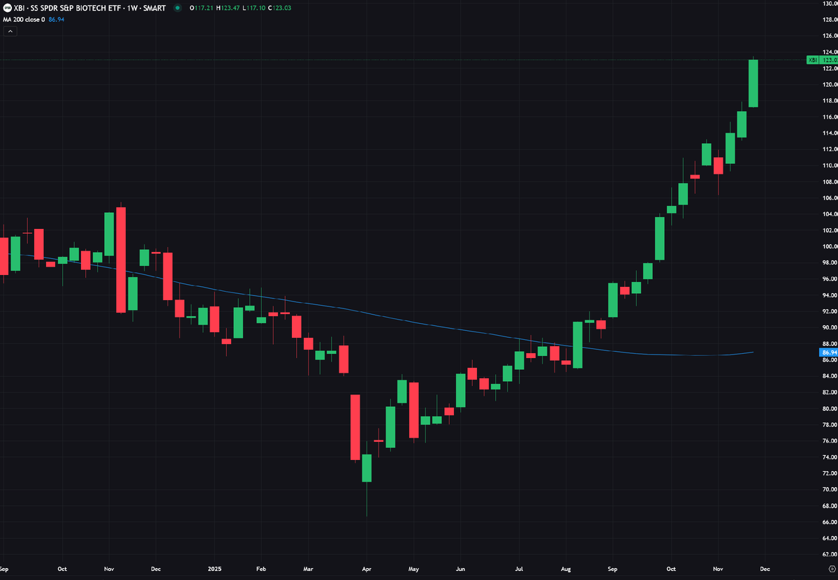 Биотехнологический сектор вновь обрёл опору после нескольких трудных лет. Фонд S&P Biotechnology ETF ($XBI) с равным весом акций продемонстрировал впечатляющий рост, чему способствовало восстановление аппетита к риску, укрепление макроэкономической ситуации и заметный рост числа сделок. Настроения инвесторов в отношении инноваций были подавлены на протяжении большей части цикла повышения ставок, но падение доходности и более чёткие политические сигналы вернули капитал в этот сектор. Этот сдвиг помог биотехнологиям опередить широкий рынок, положив конец длительному периоду относительной слабости. Несколько факторов работают в пользу биотеха. Во-первых, фондовый рынок переключился на риск, подняв сегменты с более высокой бетой, которые отставали в период ужесточения. Во-вторых, ожидания ускорения слияний и поглощений накапливались месяцами и теперь отражаются в завершённых сделках. Крупные фармацевтические компании столкнулись с приближающимся истечением сроков действия патентов и обращ