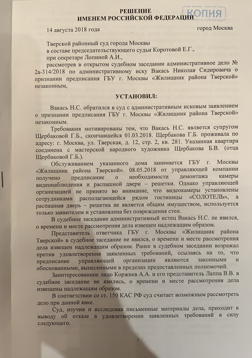 Чёрные риэлторы покусились на наследство Выдающегося русского живописца Щербакова Бориса Валентиновича Решение Тверского районного суда города Москвы от 14 августа 2018 года, где член организованного преступного сообщества черных риэлторов, ранее судимый лже-муж Вакась Николай Сидорович судится с ГБУ «Жилищник Тверской» и заявляет, что он муж дочери народного художника СССР Борис Валентинович Щербаков Щербаковой Галины Борисовны! Мошенники не могли предположить, что у художника Щербакова Бориса Валентиновича была старшая сестра - Валентина Валентиновна и любимый племянник - Дмитрий, проживавшие в городе Ленинграде, которые, как раз, и были изображена на произведении «в окружении родных» - родителей Бориса Валентиновича, отца Щербакова Валентина Семёновича и матери Щербаковой Клавдии Прокопиевны! Мошенники полагали по своему недалекому уму и из-за патологической жадности, что Щербакова Галина Борисовна была одинокой! Поэтому, подделав документы, они смело пошли в Тверской районный с