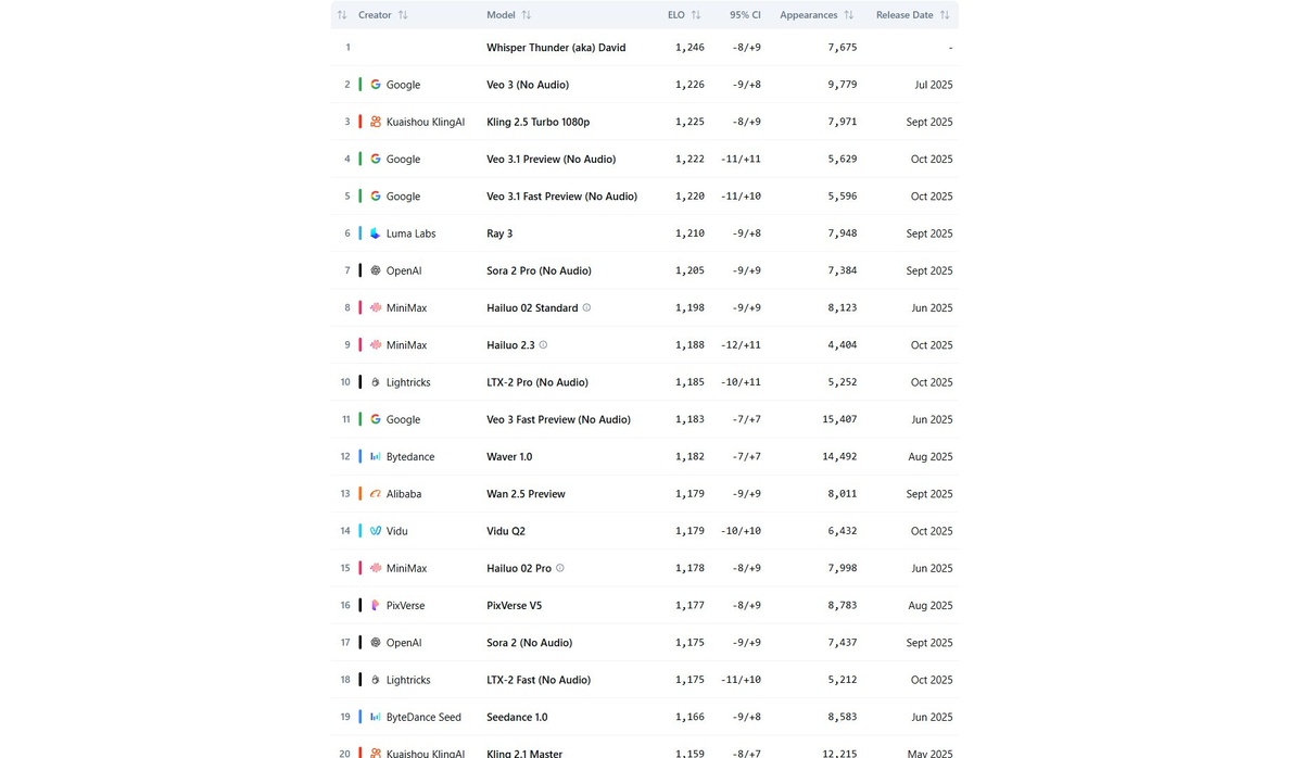 Whisper Thunder (aka David) топ 1 txt2vid Серфил всякие интересные новости в мире нижнего ии, как вдруг наткнулся на интересное проиcшествие, на довольно значимом бенчмарке Artificial Analysis появилась модель неизвестного происхождения "Whisper Thunder" (также известная как David), она заняла первое место в рейтинге txt2vid от , обойдя всех гигантов индустрии, мне показалось это очень интересным, потому что обошла она и последний Veo 3/3.1 и Sora 2 и старый добрый Kling 2.5 turbo Она набрала 1246 elo, для понимания я приложу скриншот с действующим топом в txt2vid, заработала свои elo она в честных 7675 сравнениях, в общем очень надеюсь что нас ждет что то серьезное. Думаю в течении недели-двух мы узнаем кто это Особо умные энтузиасты уже наделали сайтов модели, где ее "можно попробовать бесплатно" 😏