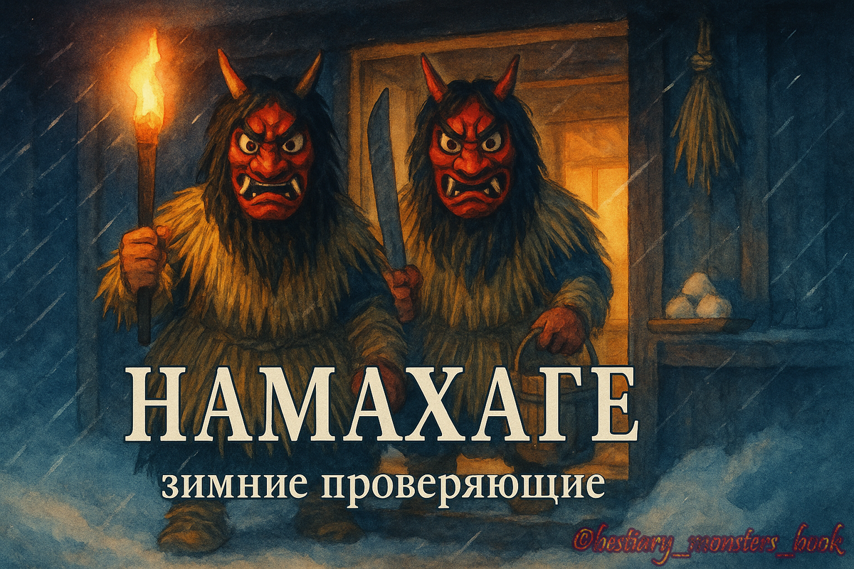 Кто ленится — бережись Ветер со снежных полей Оги несёт запах дыма и соли. Ночь синяя, как сливовая кожура, и вдруг — грохот в дверь, скрежет по косяку, тяжёлые шаги на крыльце. В проёме — соломенные шубы, красные маски с клыками, ведро и длинный нож-макет. «Эй! Есть ли в этом доме ленивцы? Плачущие дети?» — кричат Намахагэ / Namahage. Они шумные и страшные, но приходят не рвать стены: их работа — проверить, напомнить и уйти. Архипелаг знает множество «зимних визитёров», но Намахагэ — фирменный знак полуострова Ога (префектура Акита, север Хонсю). Их имя связывают с словом намахадзи — «сырые мозоли от безделья у очага»: если зимой сидишь у огня, кожа на пятках размягчается — и проверяющие «срезают» эту «ломоту» вместе с ленью. Отсюда и крик у порога: «Есть ли здесь бездельники?»