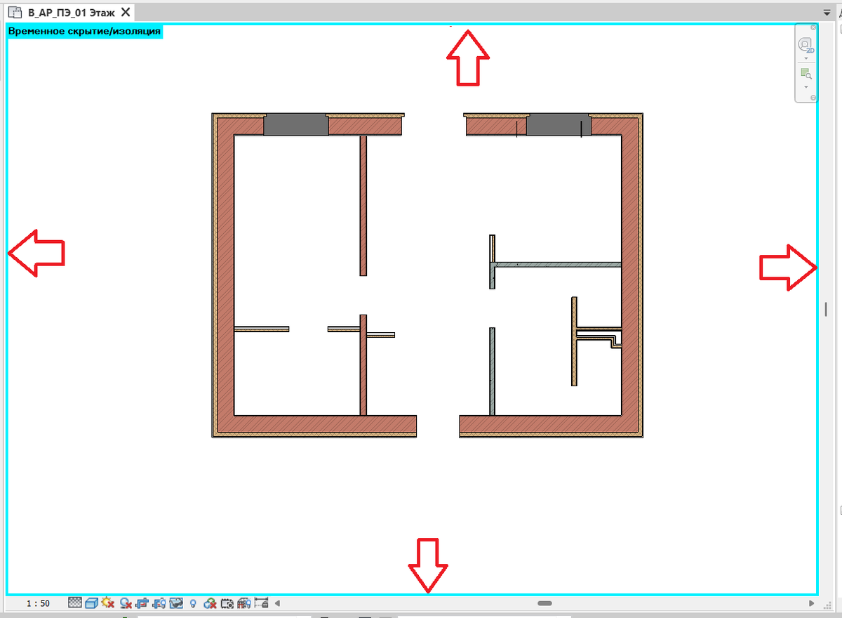 2. Далее перейдите на вид, на котором граница «Области видимости» была не видна → окно «Свойства» вида → параметр «Область видимости» → кнопка «Изменить» → в выпадающем списке выберите «Нет» → поставьте галочку в параметре «Показать границу обрезки» → увеличьте рамку обрезки при помощи курсора «Управление» (синяя точка по середине линии границы обрезки) до тех пор пока необходимые объекты не будет отображаться на виде