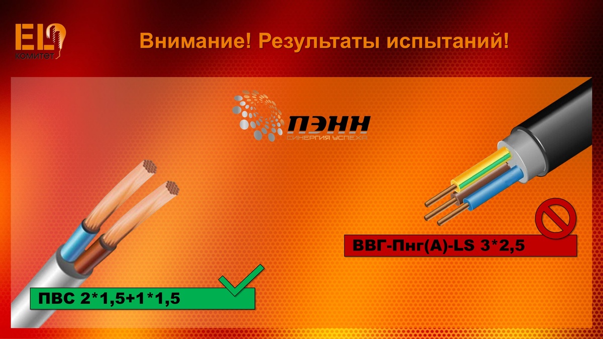 EL-Комитетом НОПСМ получены результаты испытаний образцов кабельной продукции ПВС 2*1,5+1*1,5 и ВВГ-Пнг(А)-LS 3*2,5 ТМ ПЭНН (производитель ООО «ПАРТНЕР ЭЛЕКТРО НН», г. Дзержинск, ИНН 5249145388), закупленных в магазине «Линия тока» (ИП Бабаскин М.В.) в г. Курске осенью этого года. На основании протоколов испытаний, выданных испытательным центром ООО «НПЦ РОСТ», можно сделать вывод о том, что образец продукции ПВС 2*1,5+1*1,5 ТМ ПЭНН полностью соответствует требованиям ГОСТ 7399-97, а в образце кабеля ВВГ-Пнг(А)-LS 3*2,5 выявлены несоответствия требованиям п. 5.2.5.1 ГОСТ 31996-2012 в части механической прочности и стойкости к внешним климатическим факторам (прочность при разрыве изоляции до старения). Характер выявленных нарушений свидетельствует о том, что они могут быть вызваны низким качеством полимерных материалов, использованных производителем при изготовлении изоляционного покрытия ТПЖ. 🟧 Отметим, что ранее в рамках мониторинга образцы кабельной продукции для проведения техниче