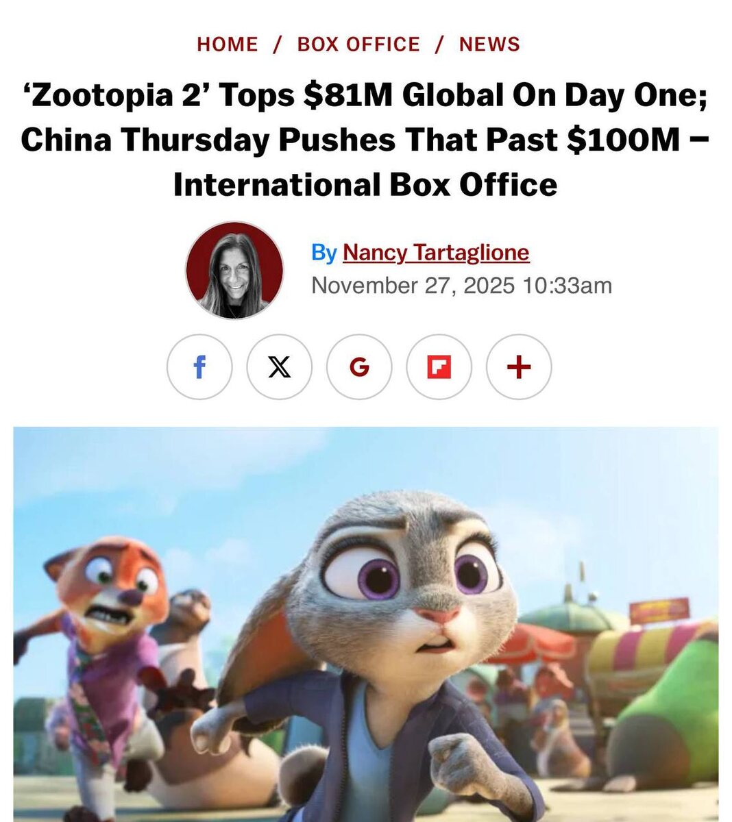 «Зверополис 2» бьёт рекорды всего за два дня мирового проката фильм собрал больше 100 млн. долларов. В Китае он показал лучший старт в истории, среди всех зарубежных мультфильмов. Аналитики предсказывают, что если темпы будут продолжаться, он сможет заработать больше $400 млн. только за первую неделю проката. CtrlAltDelights- подписаться