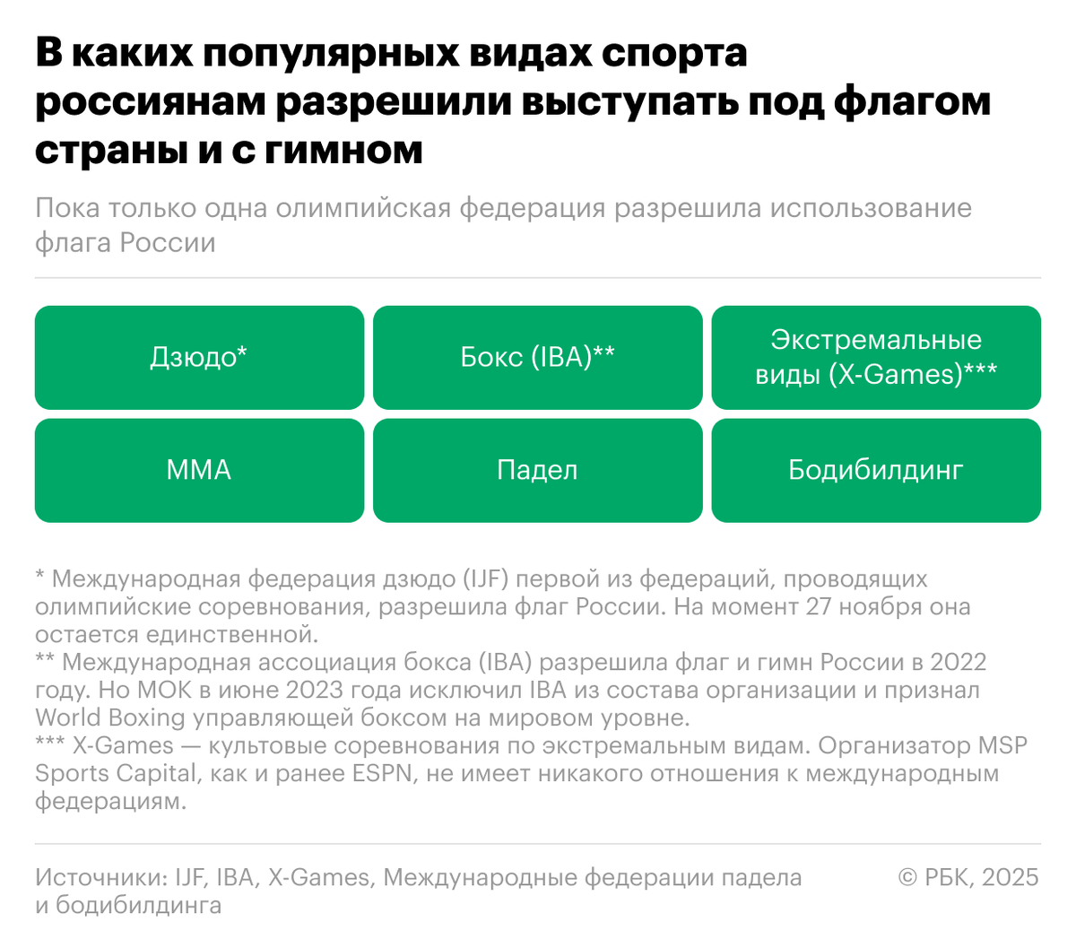 IJF разрешила дзюдоистам выступать с флагом и гимном России. Всего в шести видах спорта россияне могут соревноваться с национальной символикой. Об этом — в материале «РБК Спорт»