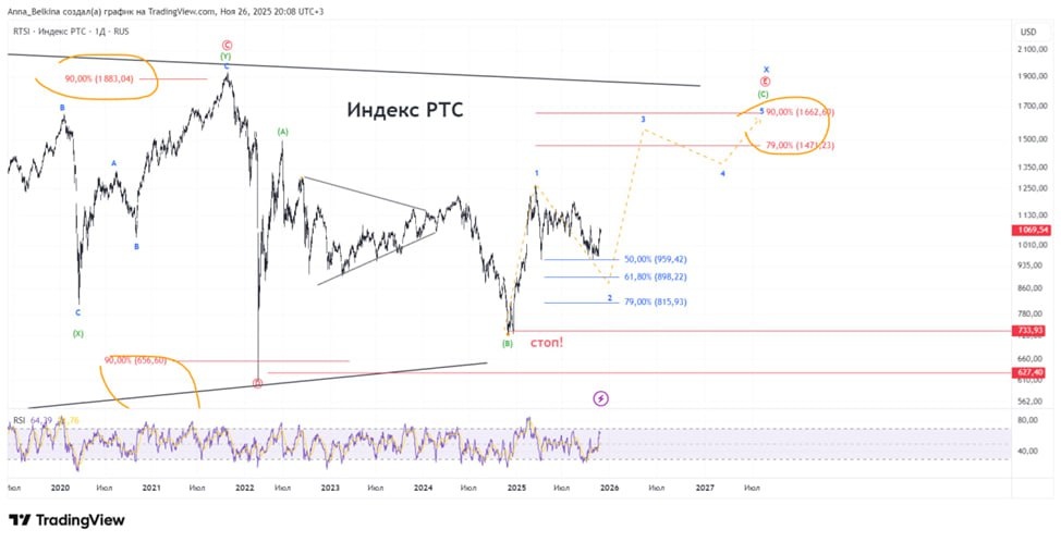 #RTSI #Ri Индекс РТС – полагаю, что с большой долей вероятности в развитии по-прежнему волна 2 of (C) of [E] of x: - В снижение не взяли 61.8% - 79% Фибо - Отработали недельный RSI - Падением октября лишь номинально обновили низы апреля - На младших степенях отсутствует импульс. Фьючерс на индекс РТС – рост в восходящей конечной диагонали, в которой также по-прежнему может ставиться нисходящая волна ii. Не является ИИР 💪 БОЛЬШЕ разметок в Закрытом канале: Бот Закрытого Канала, доступен Пробный Период! (подписаться из-за границы, пишите личным сообщением) В этом посте есть большое видео, которое не загрузилось в Дзен. Откройте оригинал поста в телеграме, чтобы его посмотреть