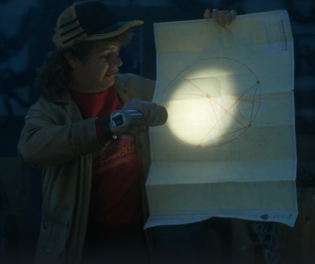 Для Дастина — ключ к форме всей аномалии. Сцена, где он разворачивает карту в темноте и подсвечивает её фонариком, стала одним из самых обсуждаемых моментов серии. И не случайно: перед нами один из лучших примеров того, как обычная школьная математика помогает распутывать мистические тайны. Дастин использует одно из базовых правил геометрии: через любые три точки, не лежащие на одной прямой, можно провести единственную окружность. Это не догадка, а точная математическая закономерность. И именно она становится основой его логики. Все три зафиксированные точки, хоть и расположены в разных частях карты, по сути являются следами одного и того же явления. А если яв