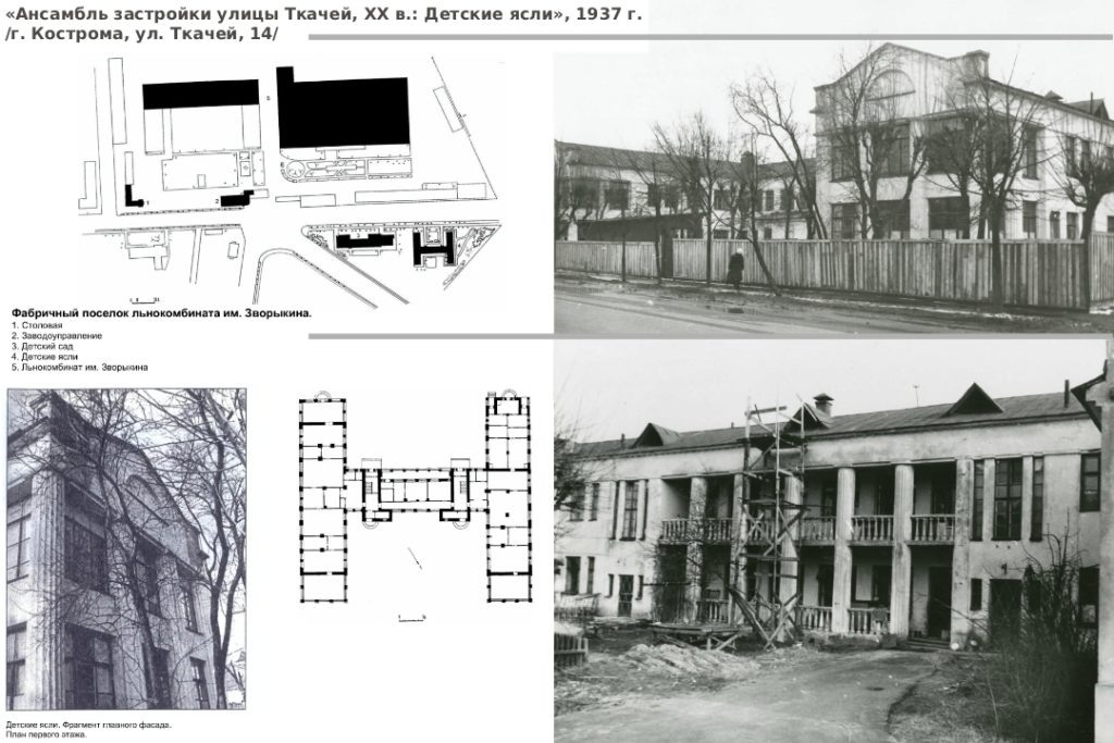 Инспекция по охране культурного наследия КО Здание находится в бывшем фабричном поселке льнокомбината, стало известно Logos44.ru. Двухэтажное здание с колоннами на улице Ткачей, 14 когда-то было детскими яслями. Их возвели для комфорта жителей фабричного поселка льнокомбината имени И.Д. Зворыкина. Комплекс также содержал сам комбинат, здания столовой и заводоуправления, а через улицу стояли жилые дома, поликлиника, детский сад. Все постройки поселка возведены из кирпича и оштукатурены. Здание яслей по форме напоминает букву Н. Фасады оформлены огромными окнами, полуколоннами, а во двор выходит лоджия. Инспекция по охране объектов культурного наследия согласовала проект предмета охраны детских яслей. Теперь за их внешним видом будут следить. Здание должно выглядеть так, как задумано проектом.