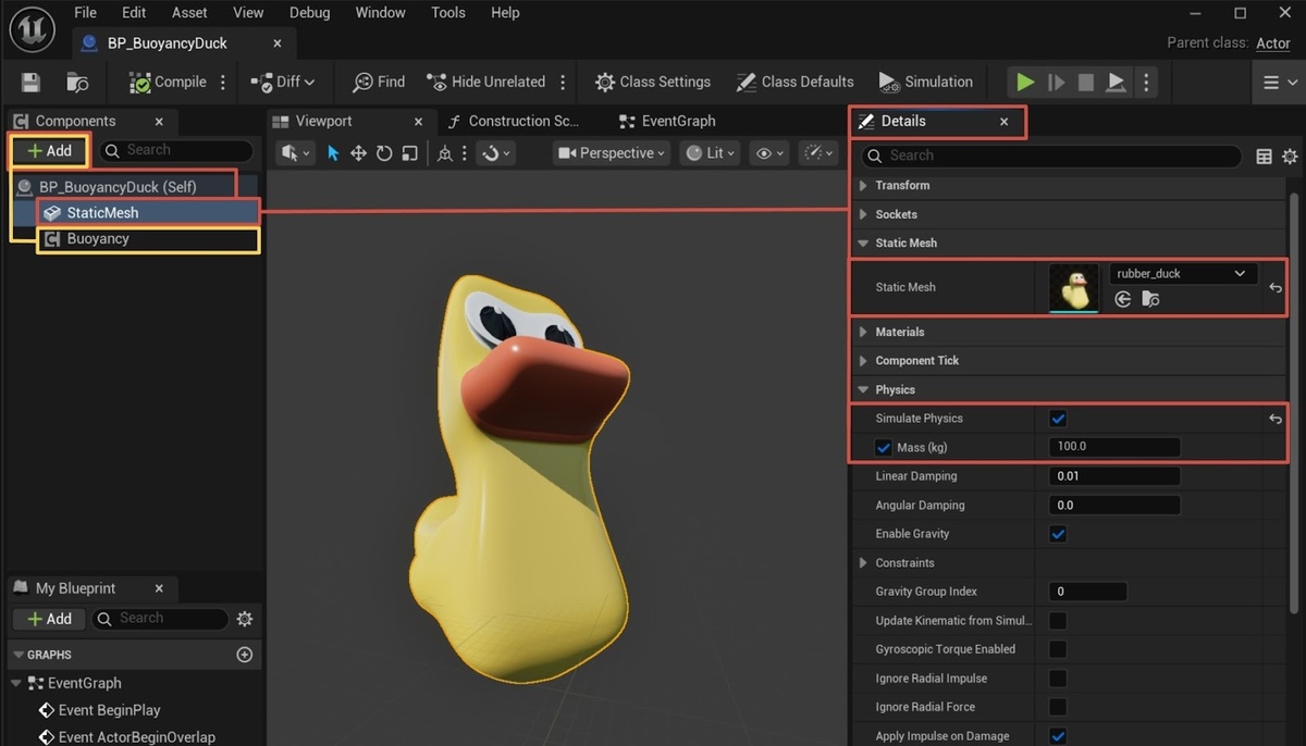 Во вкладке Components добавим два компонента: Static Mesh и Buoyancy, который позволит нашей уточке быть плавучей. 2.1 Настроим Static Mesh:
