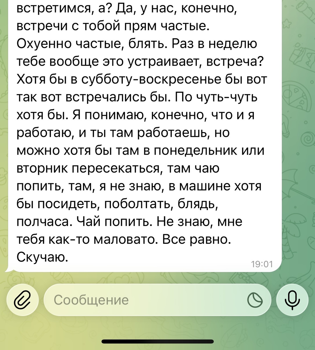 Когда человек начинает давить и требовать, его психика упирается в стену, которую построил он сам. Он думает, что так он заставит меня быть ближе, но на самом деле лишь сильнее приковывает себя к образу моей недоступности. Его потребность, встретив мое молчание, не исчезает — она превращается в навязчивую, жгучую идею, которая съедает его изнутри. А я лишь подбираю сапоги… которые он будет целовать. Он сломался. Перестал слышать не меня — а самого себя, ту часть, что предупреждала его: мое внимание нельзя купить послушанием или выпросить мольбой. Его купить нельзя вовсе. Его можно только заслужить, пока оно не стало вам безразлично. Правило было просто: «Твое требование — мой уход. Твой ультиматум — мое безразличие». Он решил проверить. И получил ровно то, о чем был предупрежден. Не я его наказываю. Я лишь следую закону, который сильнее нас обоих. Он был таким милым, пока был несвободен. Его взгляд, ловящий мое разрешение, его трепет — это было прекрасно. Но он ошибся, приняв мою м