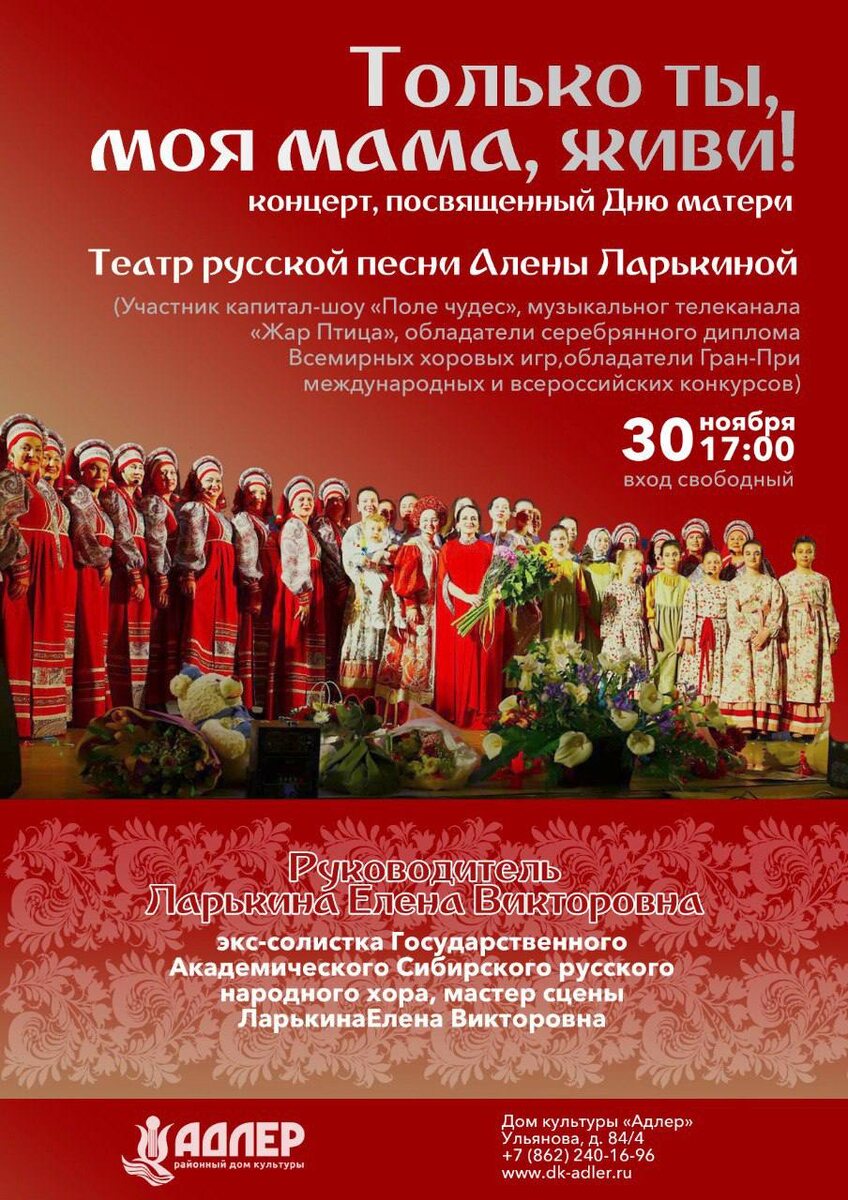 РДК АДЛЕР Театр русской песни рад пригласить вас на концерт, посвящённый Дню матери — «Только ты, моя мама, живи!» 30 ноября 17:00 Гостей ждет тёплая атмосфера, незабываемые мелодии и искренние слова благодарности самым дорогим людям — нашим мамам. Вход свободный