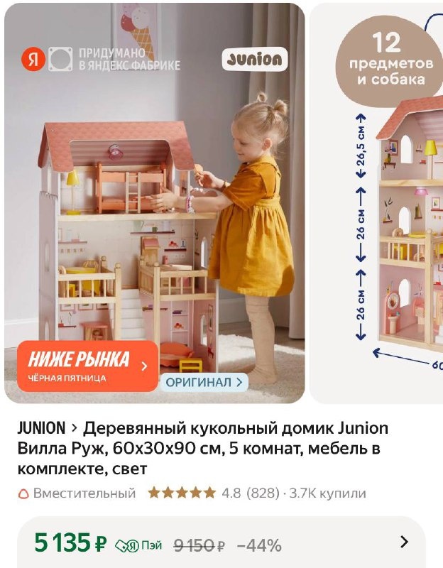Классный подарок ребенку 😍 Деревянный кукольный домик Junion Вилла Руж, 60x30x90 см, 5 комнат, мебель в комплекте, свет https://market.yandex.ru/cc/87WqUY Цена на 🛒: 5135 ₽ | 9150 ₽ рейтинг: 4.8 ⭐️ выгодная цена 💲 ✅ Подписаться 🔣 Бот с промокодами