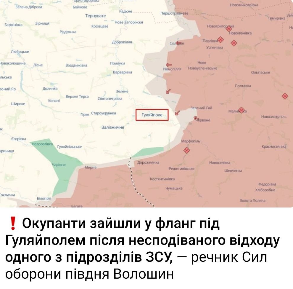 Ой 🤭 ВС РФ зашли во фланг под Гуляйполем после неожиданного отхода одного из подразделений Сил обороны, — спикер Сил обороны юга Волошин Опять отрицательное наступление. Противник признает очевидное. Группировка «Восток» прорубила коридор к Гуляйполю, бои идут в самом населенном пункте. Формулировки и причины отхода противника не важны, сам факт присутствия ВС РФ говорит о том, что скоро Украина потеряет очередной населённый пункт. И самое для Украины печальное, что всё происходит накануне подписания мирных переговоров. Подписаться на канал | 📲 MAX Мы в ВКонтакте