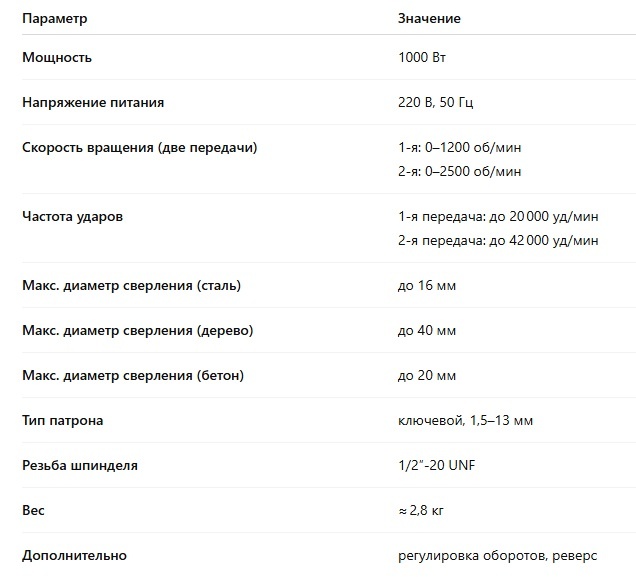 Дрель оснащена двигателем мощностью 1000 Вт. Этого достаточно для уверенного сверления даже в плотных материалах.