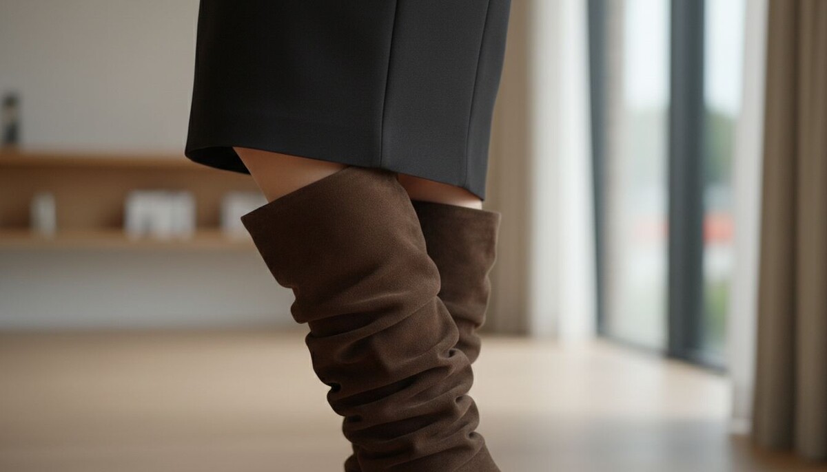 Сапоги-трубы, как правило, не имеют молнии до самого верха или обладают очень мягким голенищем, позволяющим материалу красиво «падать». Именно поэтому, когда мы говорим о главном тренде Ноября 2025, мы фокусируемся на замше (Heavy Suede) или очень мягкой, зернистой коже. Замша не только обеспечивает идеальную драпировку, но и добавляет образу невероятную глубину и богатство текстуры. Она поглощает свет, а не отражает его, что мгновенно поднимает статус всего ансамбля. Забудьте о глянцевом, жестком лаке- сейчас в моде глубина и бархатистость.