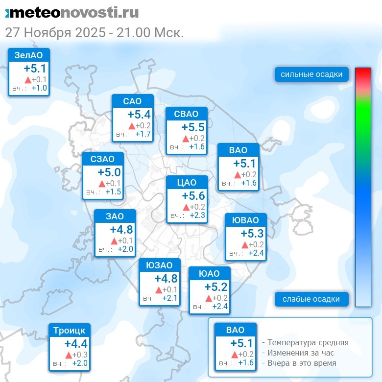 В 21:00 в Москве было от +4.1°C до +5.9°C, средняя температура +5.2°C #погода #Москва #осень #температура #27ноября #четверг