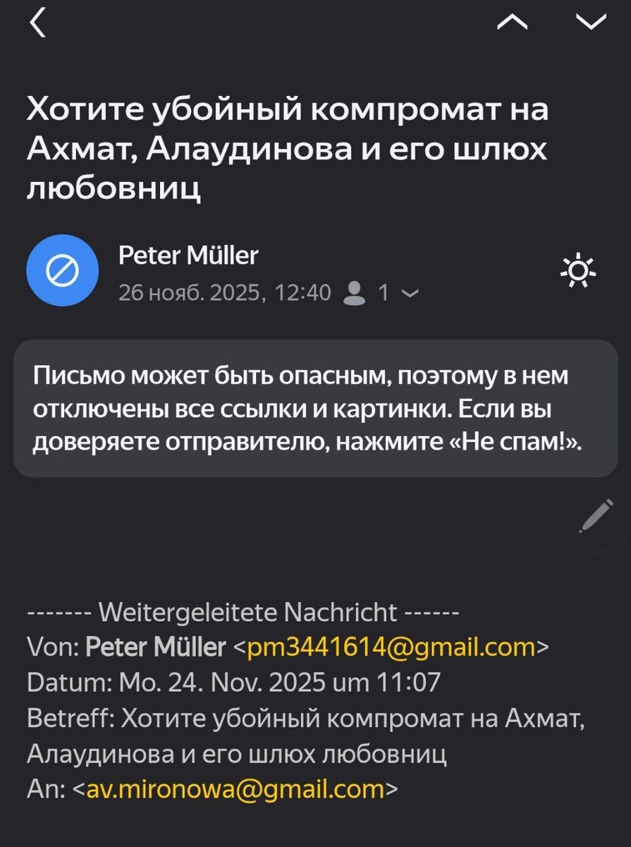 Спамерша Куня: «Чтобы никто не подумал, что ты — Петер Мюллер, надо уже заранее заявить, что ты не Петер Мюллер!» 🥴Миронова совсем потеряла связь с землёй и пошла ещё дальше — делая саморекламу не только по именитым СМИ и телеканалам России, но ещё и выслав пачку спама о своей героической борьбе в Германию: Начиная с прокуратур, полицаев, заканчивая запрещенными медузами и враждебной Дойче Велле. Всё, зольдатен, расходимся. Вызывайте скорую. 🚑 Ну а в целом — кто же себя похвалит, если не сама? Да, куня? Спасибо, что ставишь и меня в известность! Мы все, конечно, безоговорочно пойдём, сложим оружие и уйдём в лес. Твоя победила 🤡