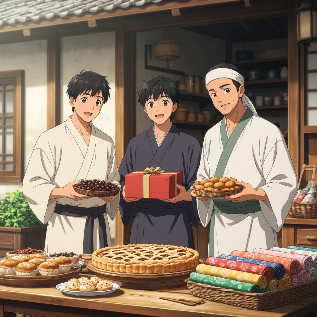 *из рассказов местных жителей. Подборка и перевод - мой. Давным-давно, в далёкие времена, три дочери вышли замуж и разъехались в разные края: одна отправилась в горы, другая — в деревню, а третья — в город. На Новый год все три дочери вместе с мужьями приехали навестить родителей. Зять из деревни явился с богатыми дарами: он принёс множество сладких бобовых пирожков и других лакомств, чтобы порадовать родных. Зять из города, торговец тканями, привёз с собой рулоны материи разных сортов — щедрый и практичный подарок. А вот зять из гор оказался небогат. «У меня нет ничего, что можно было бы подарить», — с грустью сказал он жене. Но мудрая супруга успокоила его: «Твой свёкор будет рад просто видеть нас. Он не ждёт подарков, так что не переживай и ничего не бери». Так они и приехали без даров. В тот вечер семья наслаждалась роскошным ужином, полным угощений. Ночью зятю из гор понадобилось выйти наружу. Оказавшись на крыльце, он заметил лук, висящий на перилах. Будучи опытным охотником, он