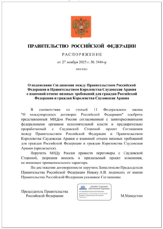 Правительство РФ официально одобрило проект соглашения о безвизовом режиме с Саудовской Аравией. Документ уже опубликован на портале правовой информации. Российскому МИД поручено провести окончательные переговоры с саудовской стороной. При достижении необходимых договоренностей вице-премьер Александр Новак подпишет итоговый документ от имени кабмина. Соглашение вступит в силу через 60 дней после того, как Москва и Эр-Рияд уведомят друг друга о завершении всех внутренних процедур. Тогда российские туристы смогут находиться в Саудовской Аравии до 90 дней в году без необходимости оформления виз. Аналогичные меры будут действовать и в отношении граждан СА на территории РФ. @tourdom