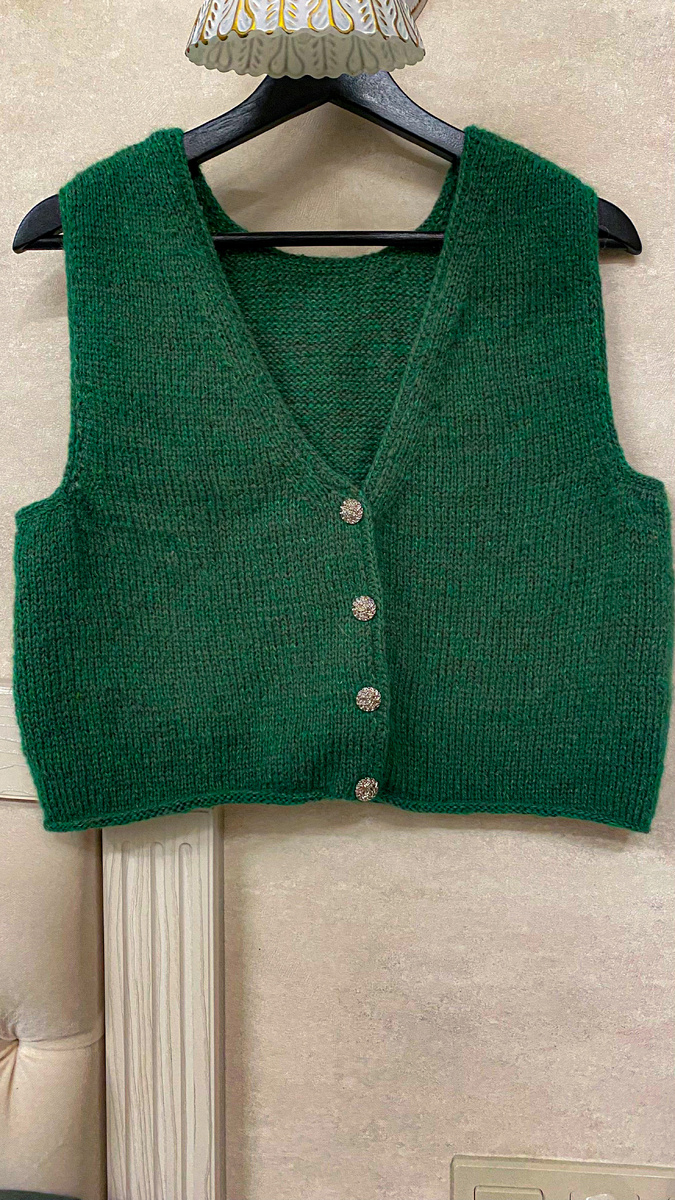 Пряжа: Одна нить: пряжа бобинная, Millefili Art. Aff-Hair альпийский луг, состав 30% альпака, 6% меринос, 36% акрил, 38% ПА. Вторая нить: Alize Lanagold, 49% шерсть, 51% акрил. Размеры изделия: ширина 50 см, длина 47 см, высота выреза горловины 24 см, ширина горловины 19 см. Примерно 44-48 женский размер. спицы: 3,5. Плотность вязания: 2п на 3,25р Вяжем на обхват груди 95см . 95*2 = 190 190п Вяжем поворотными рядами на необходимую высоту, в моем случае это 80рядов, при этом не забывая делать отверстие для пуговиц (две петли закрываем и делаем два накида в каждом 19ряду). Далее 3п закрываем и вешаем маркеры 39п (правая полочка), 16п (подрезы закрываем), 77п (спина), 16п (подрезы закрываем), 39п (левая полочка). 3+39+16+77+16+39 = 190п В каждом лицевом ряду делаем убавку по одной петле на вырез рукава (всего 4 петли убавим). Чтобы был плавный переход к подрезам. Убавки делаем с двух сторон симметрично. То есть когда спинку будем вязать, не забываем сделать убавки на вырез рукава