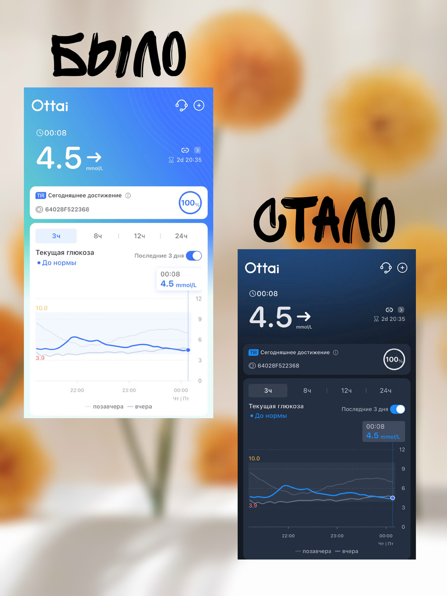 В последнем обновлении приложения к датчику непрерывного мониторинга уровня глюкозы Ottai появилась возможность установки тёмного фона. Кто использует, как вам? Мне так больше нравится. Как будто бы «не бьёт» слишком яркий цвет в глаза.