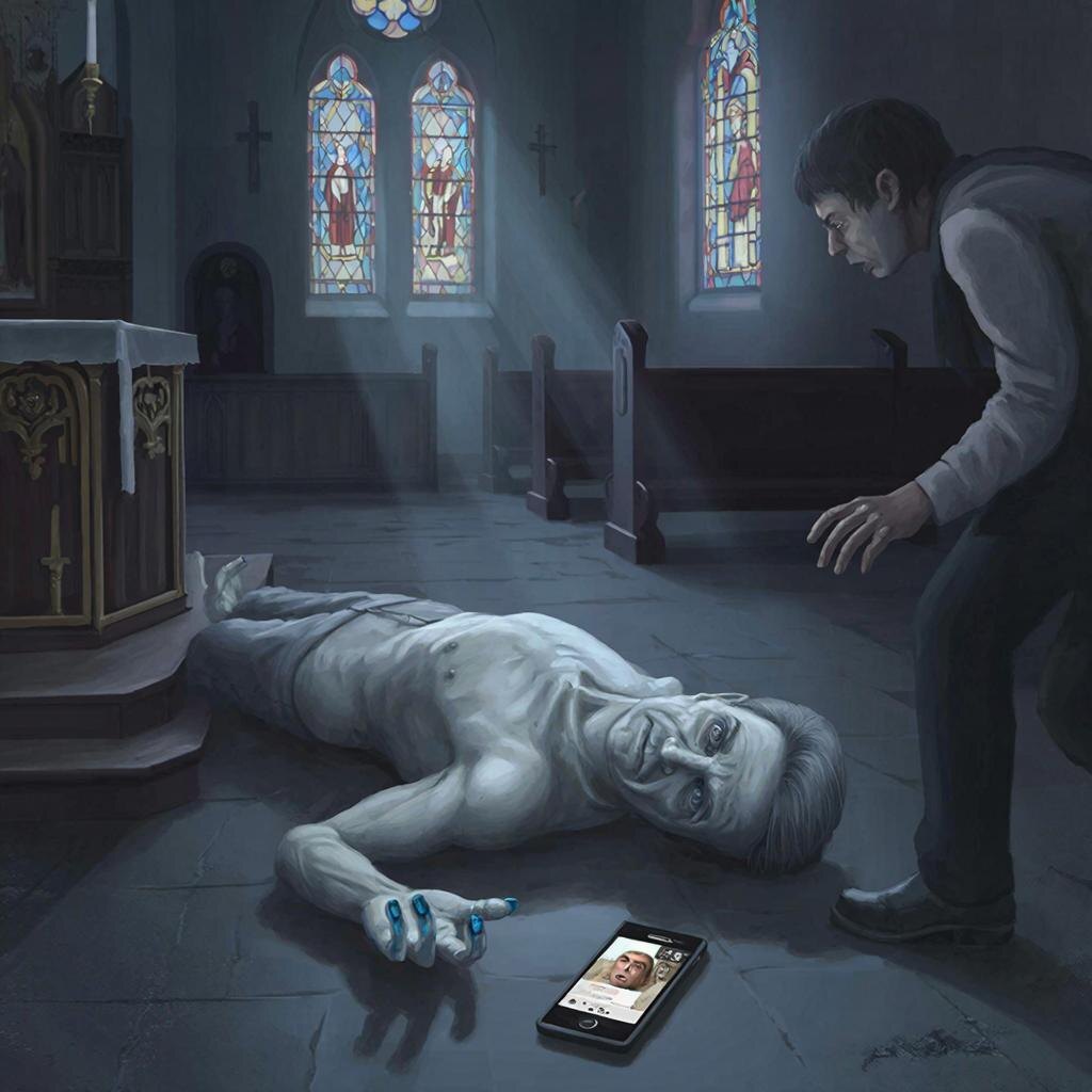 Я проснулся от резкого звука уведомления — служебное сообщение на рабочий телефон. Едва начало светать, а день уже обещал быть непростым. Через полчаса я уже мчался по утренним улицам к местной церкви — дежурный сообщил о трупе. Когда я вошел в полутемный храм, воздух будто сгустился вокруг. Запах ладана смешался с чем-то металлическим, едва уловимым. У алтаря, в лучах рассветного солнца, пробивавшихся сквозь витражи, лежал он — Александр Иванович Воронцов. Я подошел ближе, стараясь не нарушать неприкосновенности места происшествия. Тело выглядело… неестественно бледным. На первый взгляд — никаких ран, никаких следов насилия. Но опытный взгляд сразу подмечает детали: кожа бледная, заостренные черты лица, мраморная окраска кожных покровов, синие губы и ногти. Так бывает, когда человек погибает от потери крови. Но самое странное — ни капли крови. Ни на одежде, ни на полу, ни на ближайших поверхностях. Будто кто-то аккуратно собрал каждую каплю. Я присел, внимательно осматривая тело