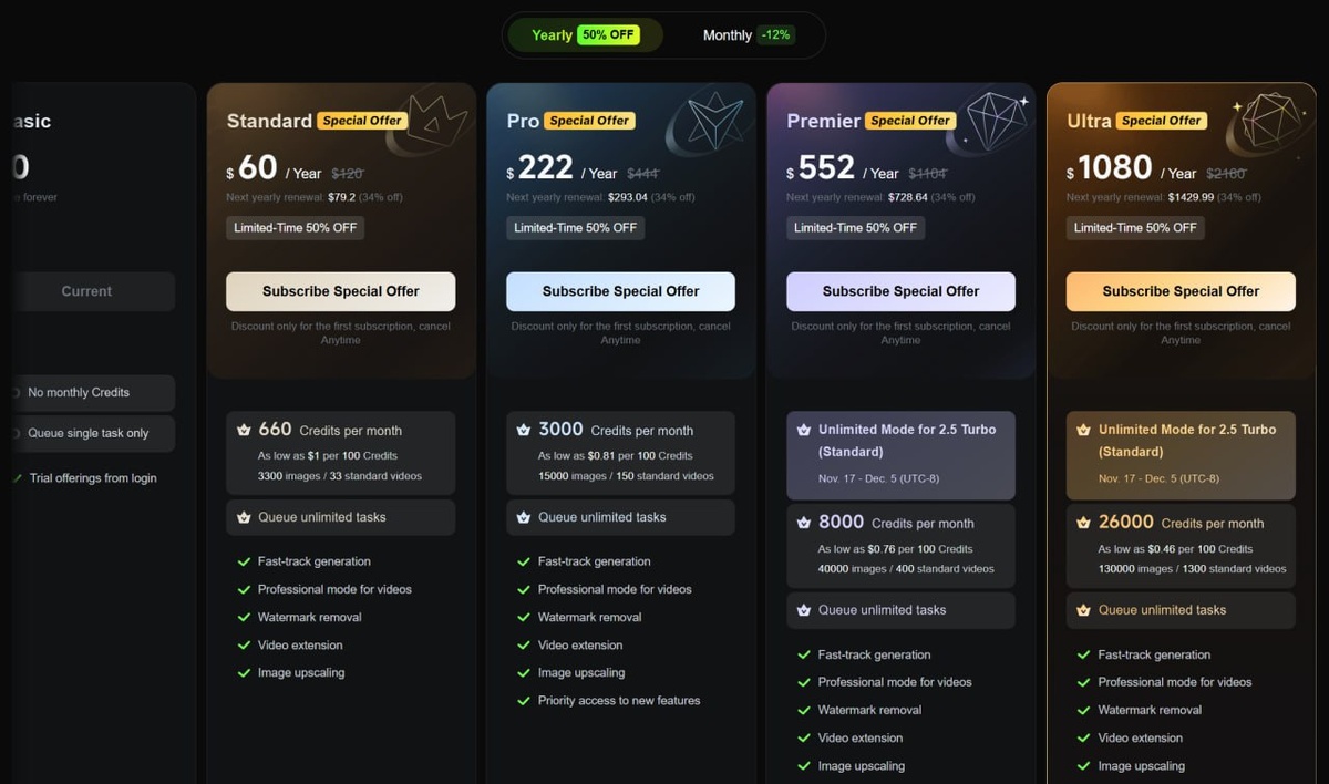 : Видео Kling — 50% на годовые тарифы и +40% кредитов бонусом. Ещё +50% кредитов (до 5000) для новых акков по коду 7B9BGRUJQN8P Minimax — 60% на годовые тарифы LTX — 40% на годовую подписку. Картинки Recraft — 50% на годовой тариф по коду BF2025 и 10% с API кредитов по коду API10 Phygital+ — 40% на годовой тариф PixVerse — 40% на тариф Ultra. ImagineArt — до 65%, плюс безлимитная Nano Banana Pro агрегаторы Freepik — 50% на годовые планы и сниженная стоимость кредитов 3D Rodin — 50% на первый месяц Creator и Business тарифов KIRI Engine — 55% на годовой тариф Cascadeur — 45% на новый акк или 30% на продление годового тарифа. Код Black2025 Музыка/Аудио Suno — 40% скидка на годовые Pro и Premier, 20% на один месяц Pro и Premier. В веб-версии при улучшении подписки нужно выбрать Immediately with Proration, чтобы она применилась. Tunee — для всех, кто взял или обновил подписку дают бонусные кредиты. ElevenLabs — тариф Starter за 1$ на первый месяц. Текст/Код/Компьют Replit — публикаци