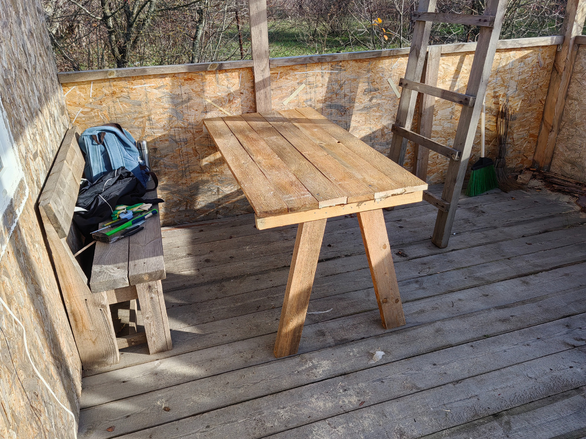 На всю сборку стола у меня ушло примерно 1,5-2 часа. Результатом я остался доволен. Даже получилось лучше, чем я ожидал. В тот же день успел и обновить стол: складывал какие-то вещи, а потом обедал за ним. В паре с лавочкой, которую еще давно мать собирала, получился вообще замечательный комплект.