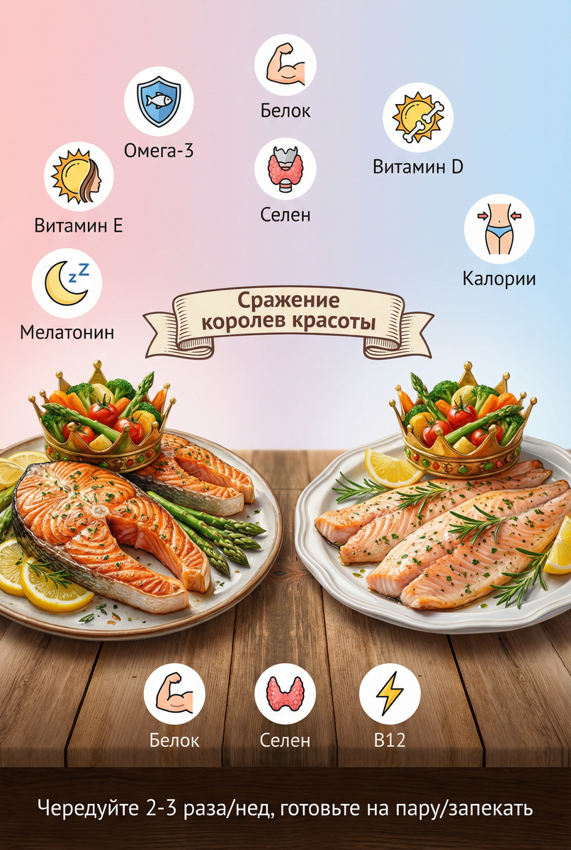 Вы стоите в рыбном отделе супермаркета и смотрите на две красивые рыбки с переливающимся мясом - розовую сёмгу и нежную форель. Обе выглядят как королевские деликатесы, обе стоят недёшево, обе обещают красоту и здоровье. Но какая из них действительно будет вашей личной лучшей подругой? Какая победит в этой эпической битве за вашу молодость, красоту и женское здоровье? Давайте разберёмся, опираясь на научные данные и рекомендации ведущих диетологов.