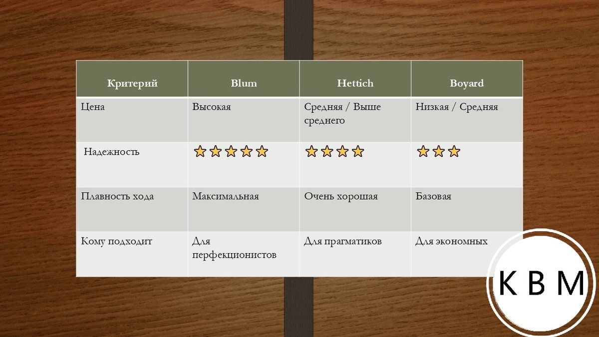 Всем привет! После нашего разбора основ системы Push-to-Open получили много вопросов: «А чье же решение лучше?». Как эксперты, мы не можем дать однозначный ответ — у каждого бренда свои сильные стороны. Поэтому сегодня объективно сравниваем тройку лидеров. Критерии сравнения: · Цена: Соотношение стоимости и предлагаемого качества. · Надежность: Репутация и отзывы о долговечности механизма. · Универсальность: Для каких фасадов и конструкций подходит. · Дополнительные «фишки»: Уникальные особенности бренда. -— 1. Blum (Австрия) 👑 Позиционирование: Премиум-сегмент. Эталон надежности и инноваций. · Система: Servo-Drive (электромеханическая) и механика. · Плюсы: · Высочайшая надежность: Ходовая фраза «поставил Blum и забыл» — именно про них. Механизмы рассчитаны на сотни тысяч циклов. · Плавность хода: Доводчик срабатывает бесшумно и очень мягко, фасад буквально «выплывает». · Электромеханика (Servo-Drive): Лидер в сегменте решений с автоматическим открыванием. · Минусы: · Цена: Самые