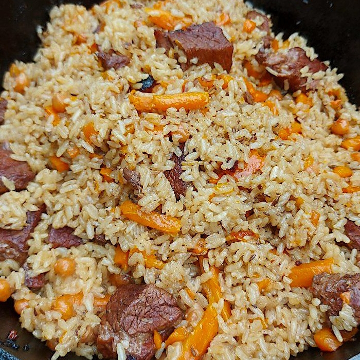 Перейдем к делу! Надо сказать, что существует множество рецептов плова в разных национальных кухнях, но сегодня мы будем готовить вариацию чайханского узбекского плова, этот плов отличается сытностью и характерным темным цветом риса. Я буду готовить в настоящем чугунном казане на газовой плитке, но точно такой же плов вы можете приготовить на домашней плите в практически любой кастрюльке (лучше всего толстостенной) или жаровне, если казана у вас нет.