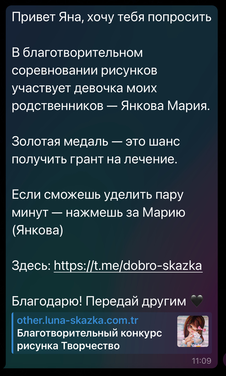Видимо новый способ получить данные к вашему аккаунту Пишут вот такое вот сообщение Создали сайт с картинками детишек Когда переходишь к голосованию Ну уже странно почему нужен авторизоваться Но сам телеграм предупреждает о том что даже если телеграм требует код, то не нужно его нигде вводить и назвать я под сомнением в общем, и помочь хочется и аккаунт терять не хочу ктото сталкивался ?