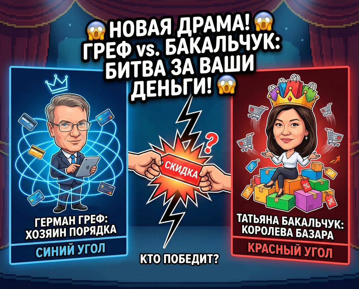 На главной сцене нашего цифрового театра — новая драма. В схватке сошлись два кукловода, управляющие вашими кошельками. В синем углу — Герман Греф, хозяин системного порядка, чья банковская паутина опутала всю страну. В красном — Татьяна Бакальчук/Ким, королева стихийного базара, чья империя построена на вашей жадности и импульсивности. Они затеяли публичную грызню из-за того, что вы привыкли наивно называть «скидкой». Не обманывайтесь. Они спорят не о справедливости. Они делят право на ваши кошельки и ваши мозги. Метод Грефа: «Порядок — это когда все деньги у меня» Греф, этот жрец порядка и контроля, вдруг заметил, что мимо его кассы пролетают триллионы. Люди заводят карточки каких-то «Вайлдберриз банков», чтобы купить китайский хлам на 300 рублей дешевле. Для его империи, ворочающей 110 триллионами, это пыль. Но это непорядок. Это бунт на его цифровой плантации. Его претензия проста: вы уводите моих рабов. Вы заставляете их открывать счета в своих карманных банках. Это «неравные усл